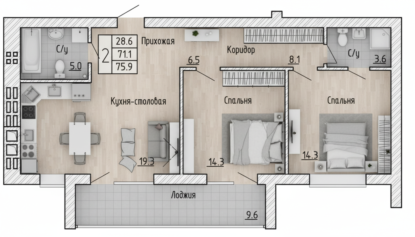 Купить 2-к квартиру, №79, 75,9 м², ул. Генерала Бакланова д1, 4 этаж