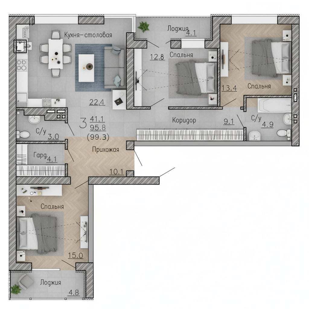 Купить 3-к квартиру, №25, 99,3 м², ул. Атамана Белова 1 поз 2, 1 этаж